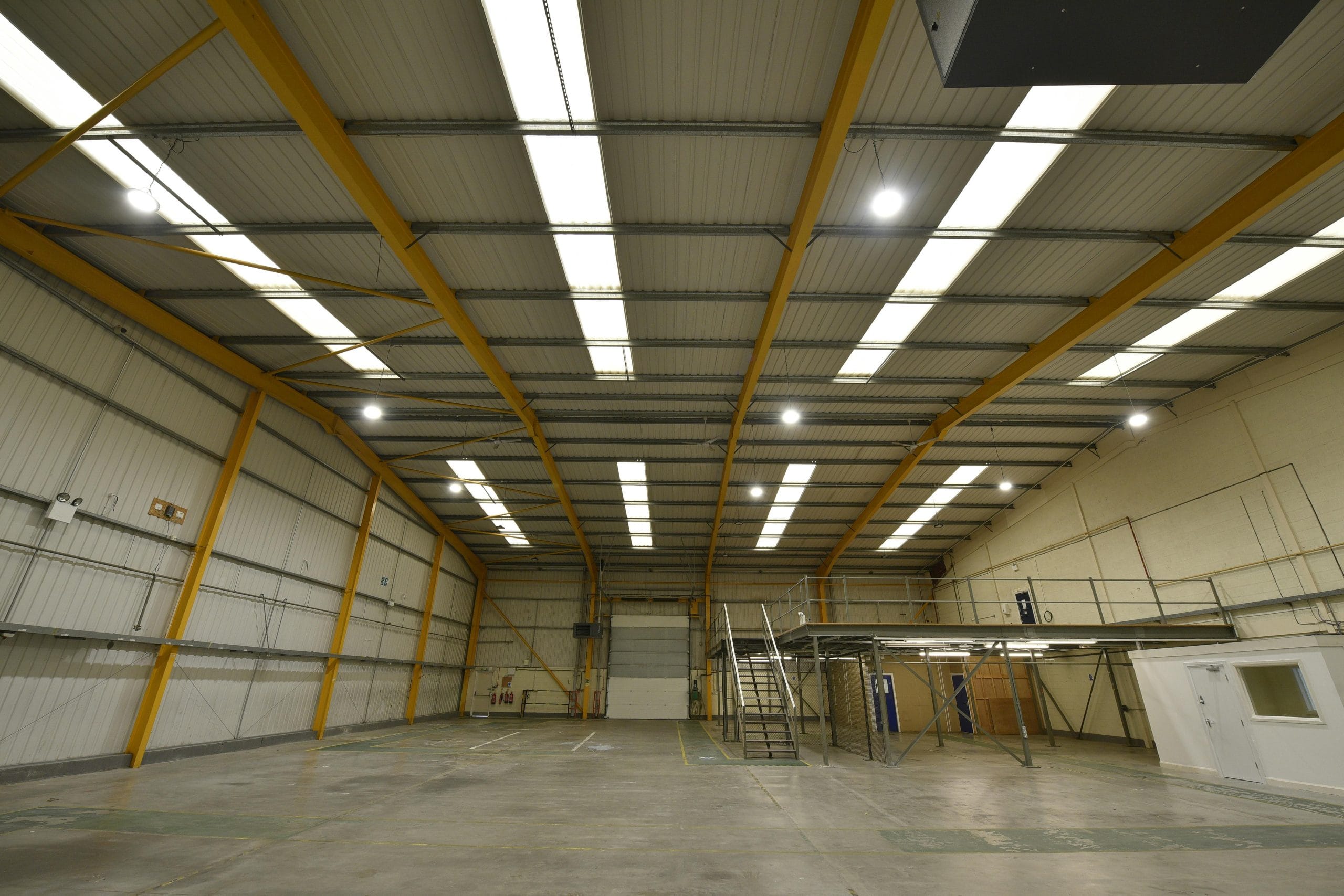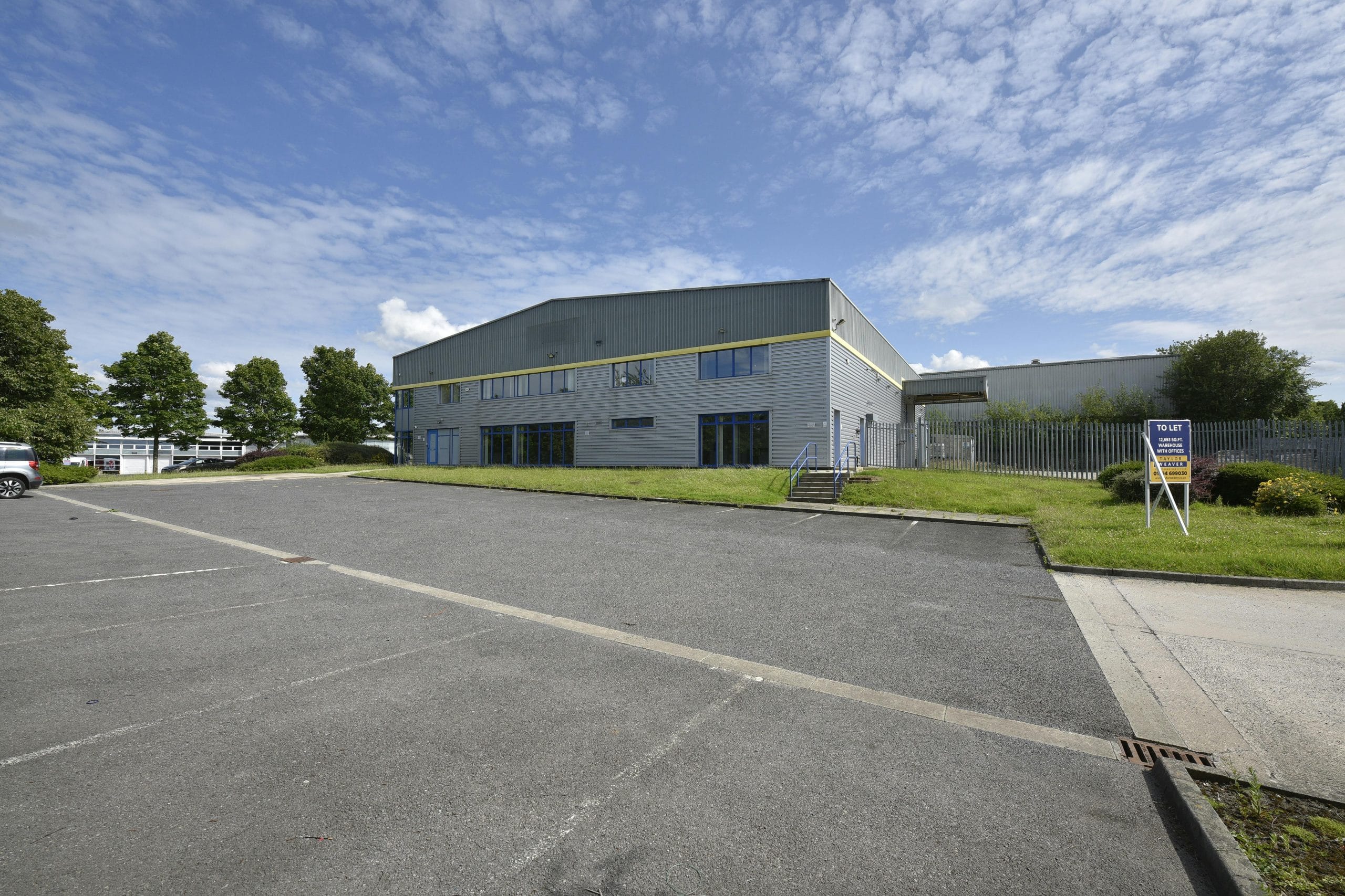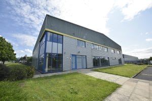 The property is a modern industrial/warehouse unit of steel portal frame construction, featuring two-storey offices with meeting rooms and break out